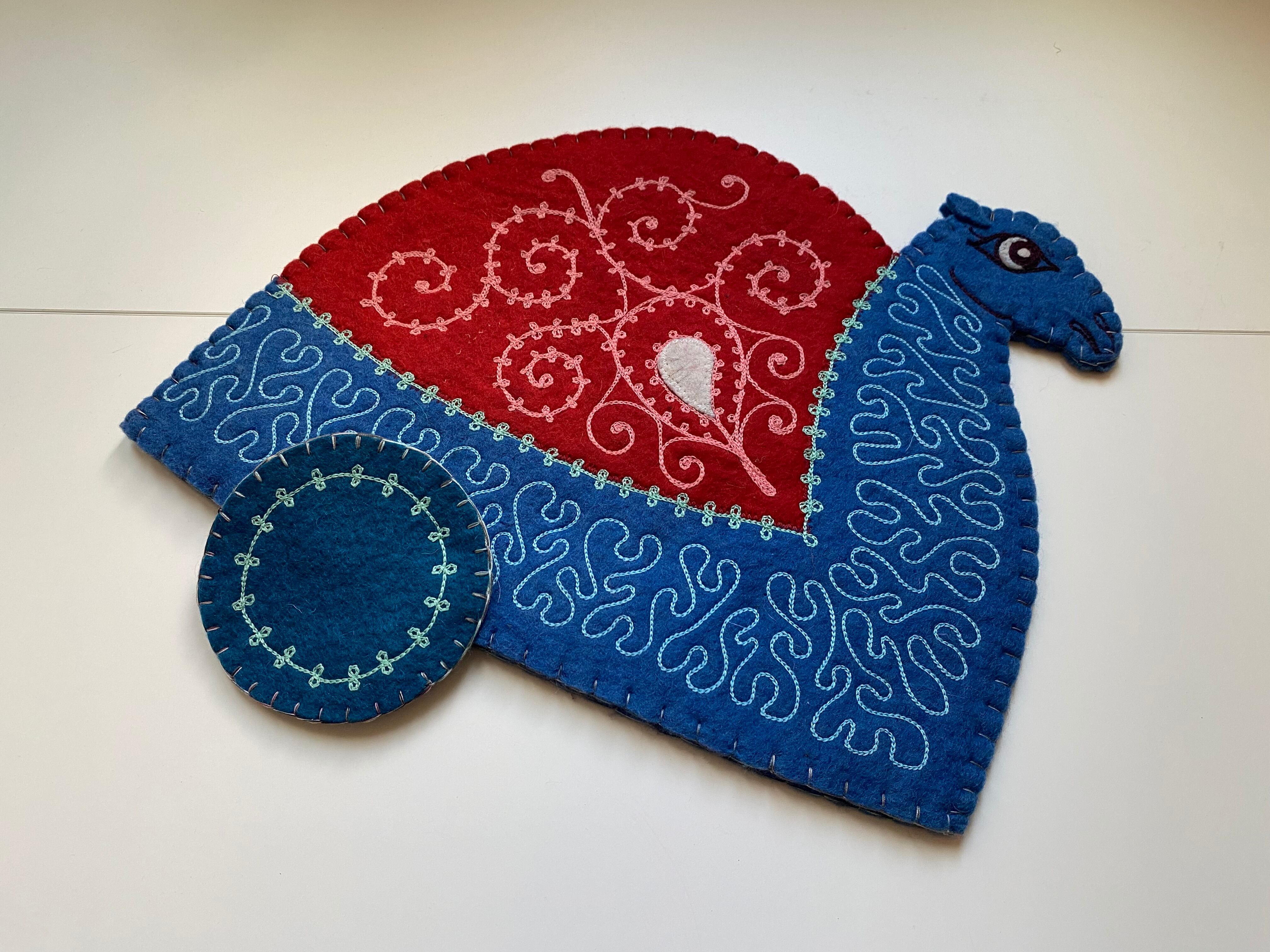 羊毛フェルトのポットカバー(らくだ/青赤)