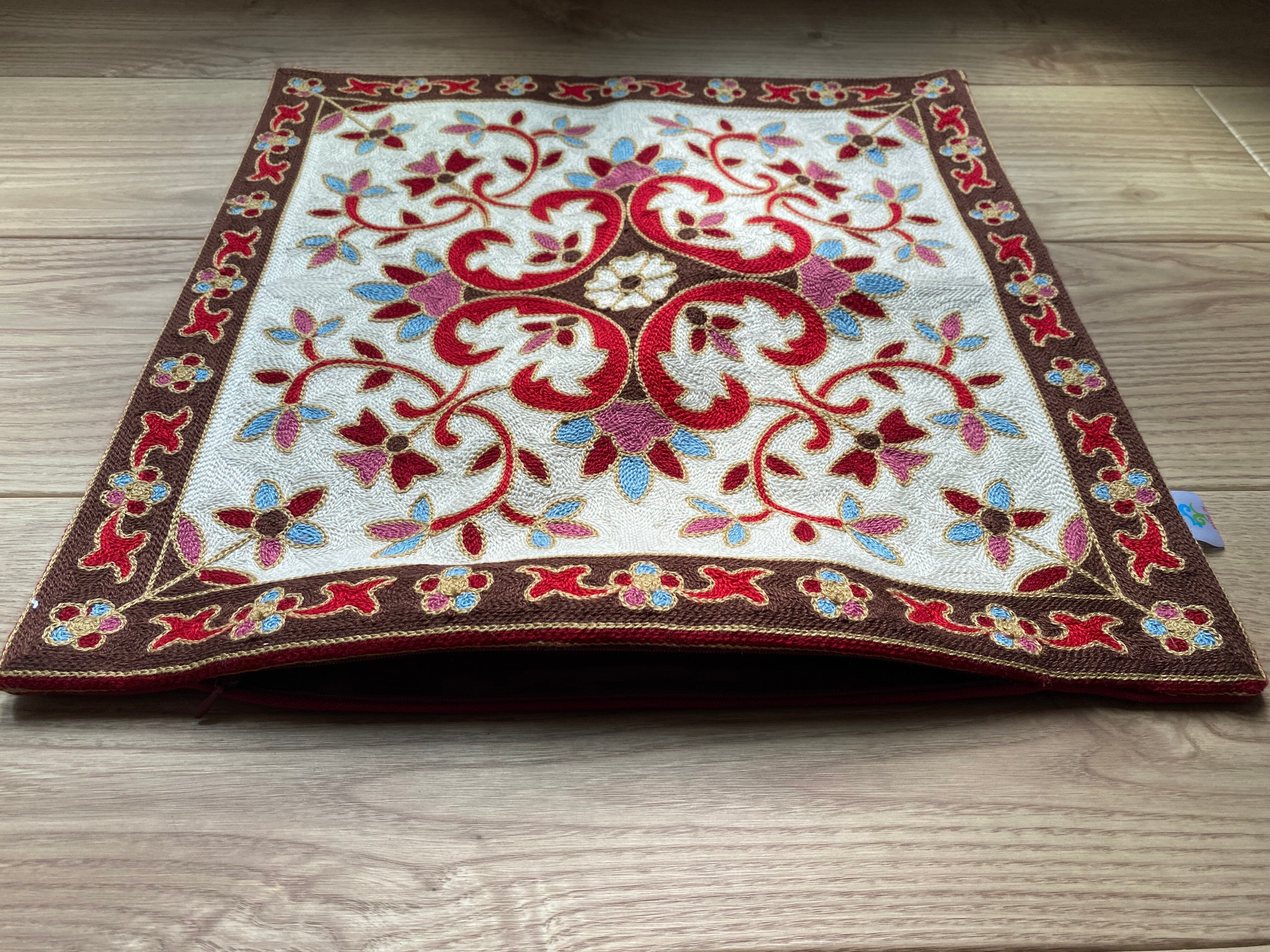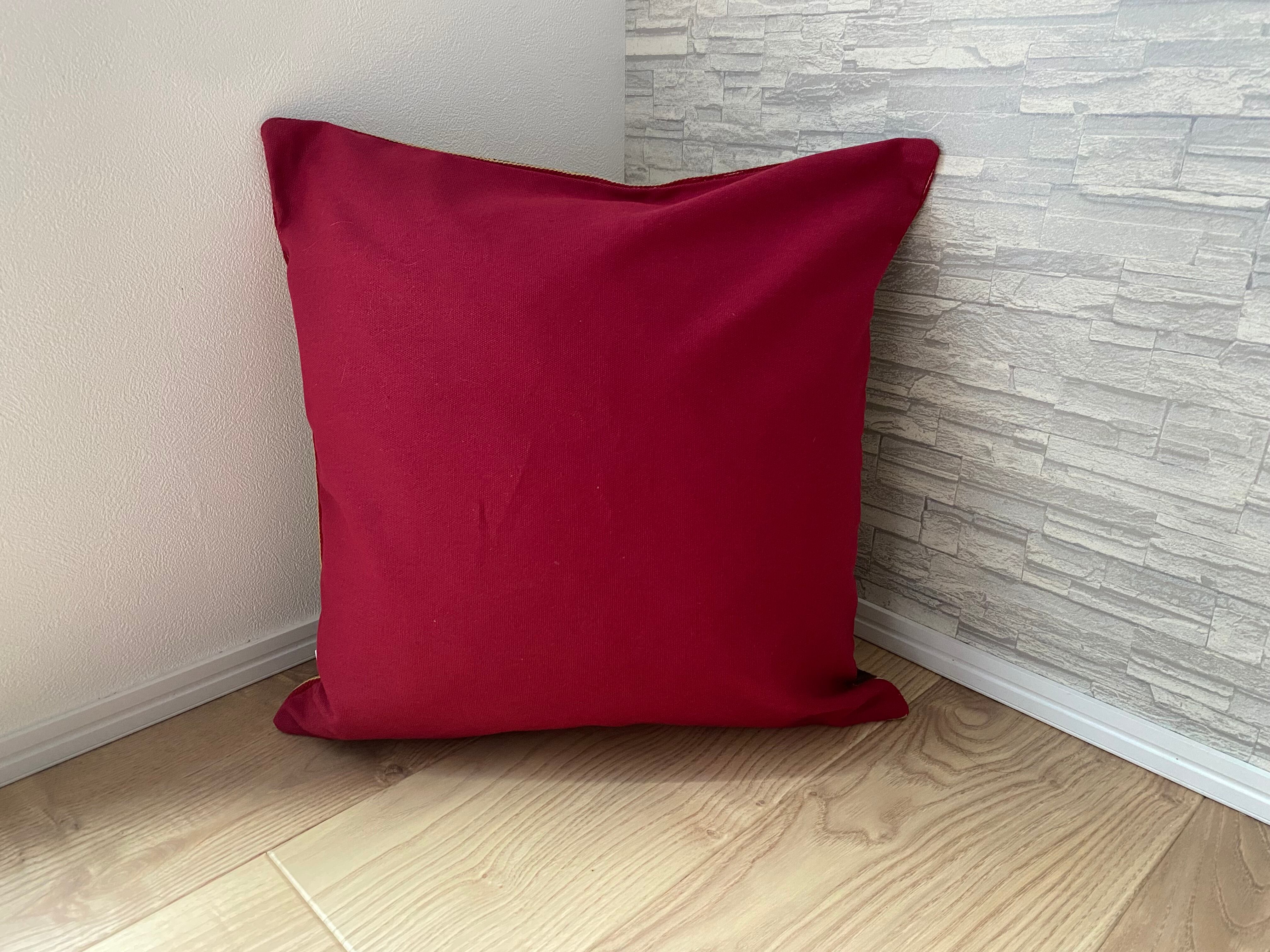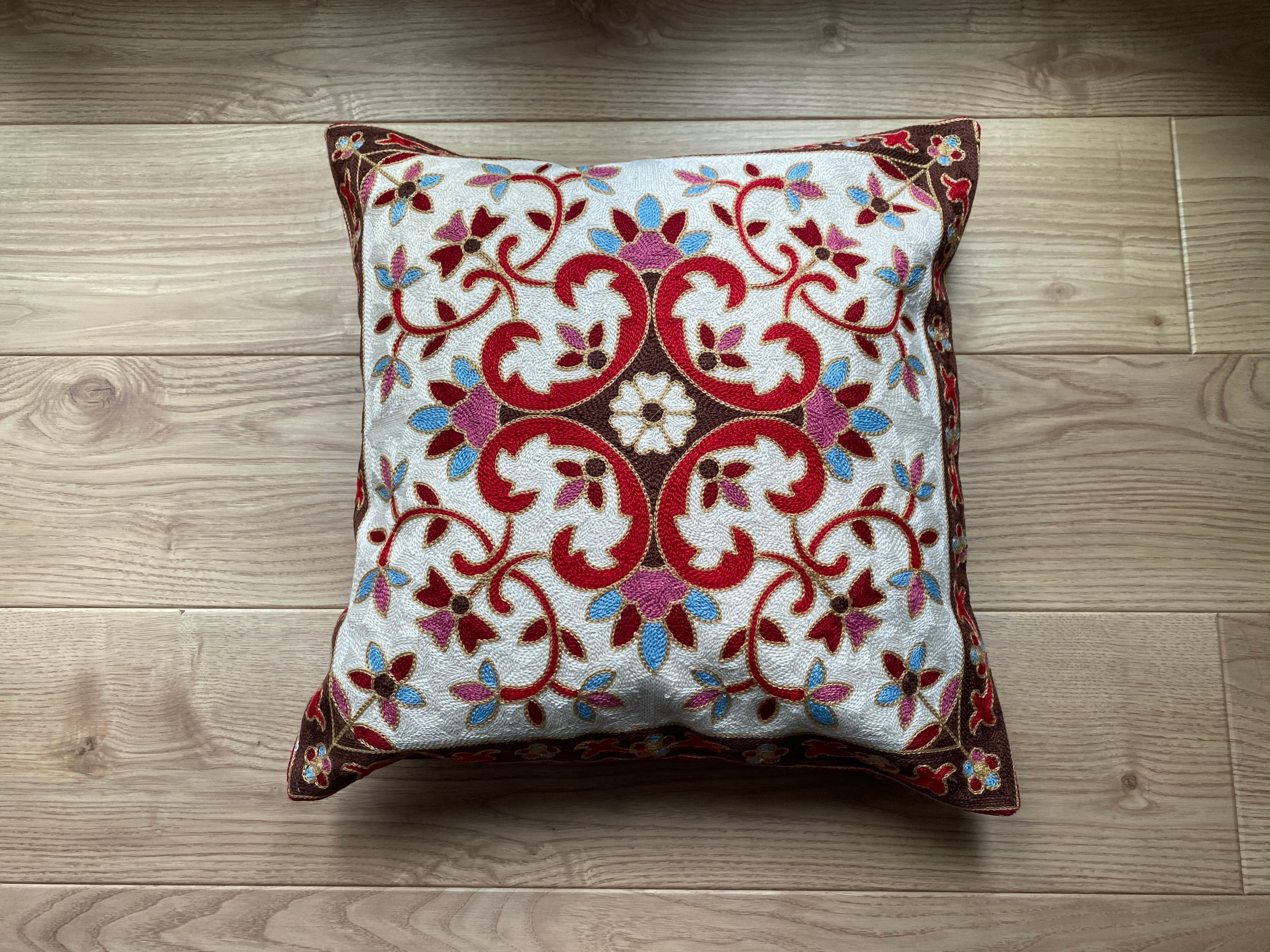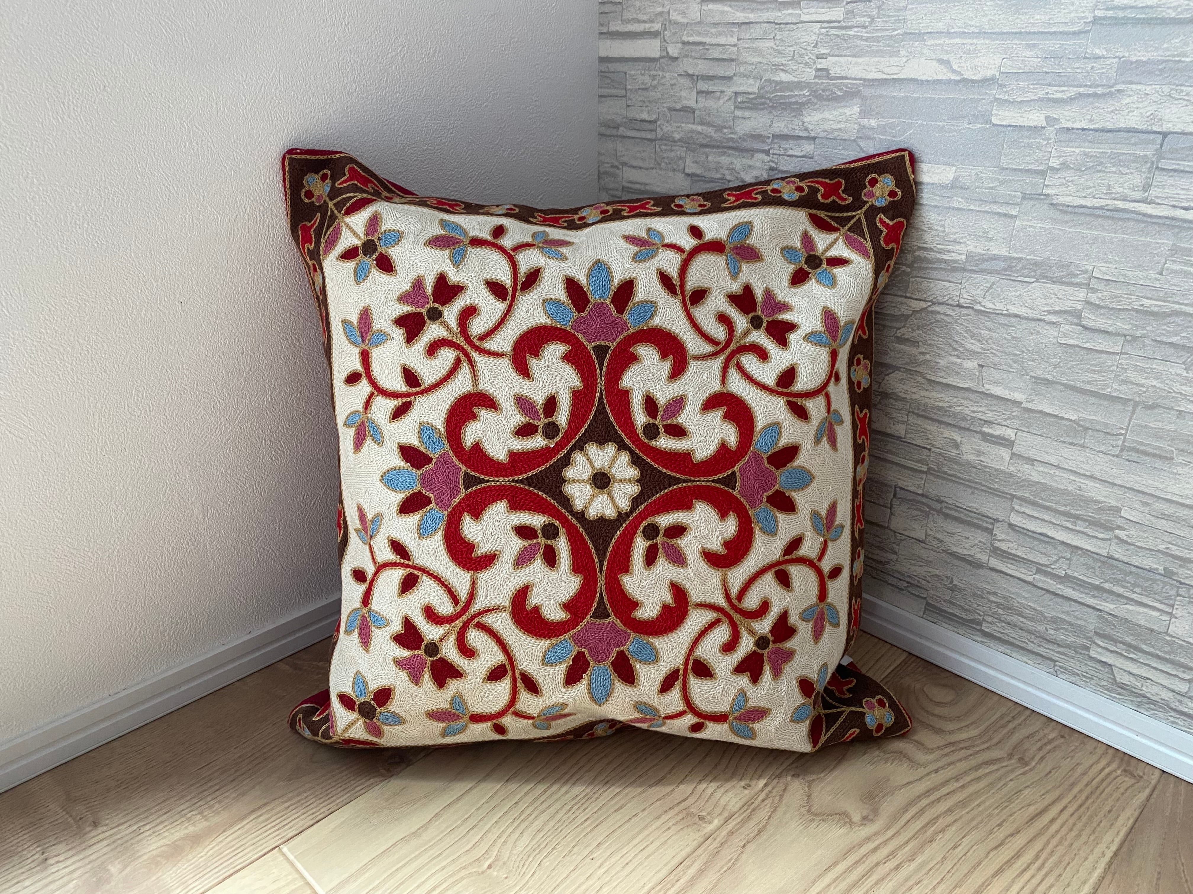 表面は、全面に細かな刺繍が施されており、とても鮮やかです。印象的なデザインと多彩な色使いで、お部屋を華やかに彩ってくれます。