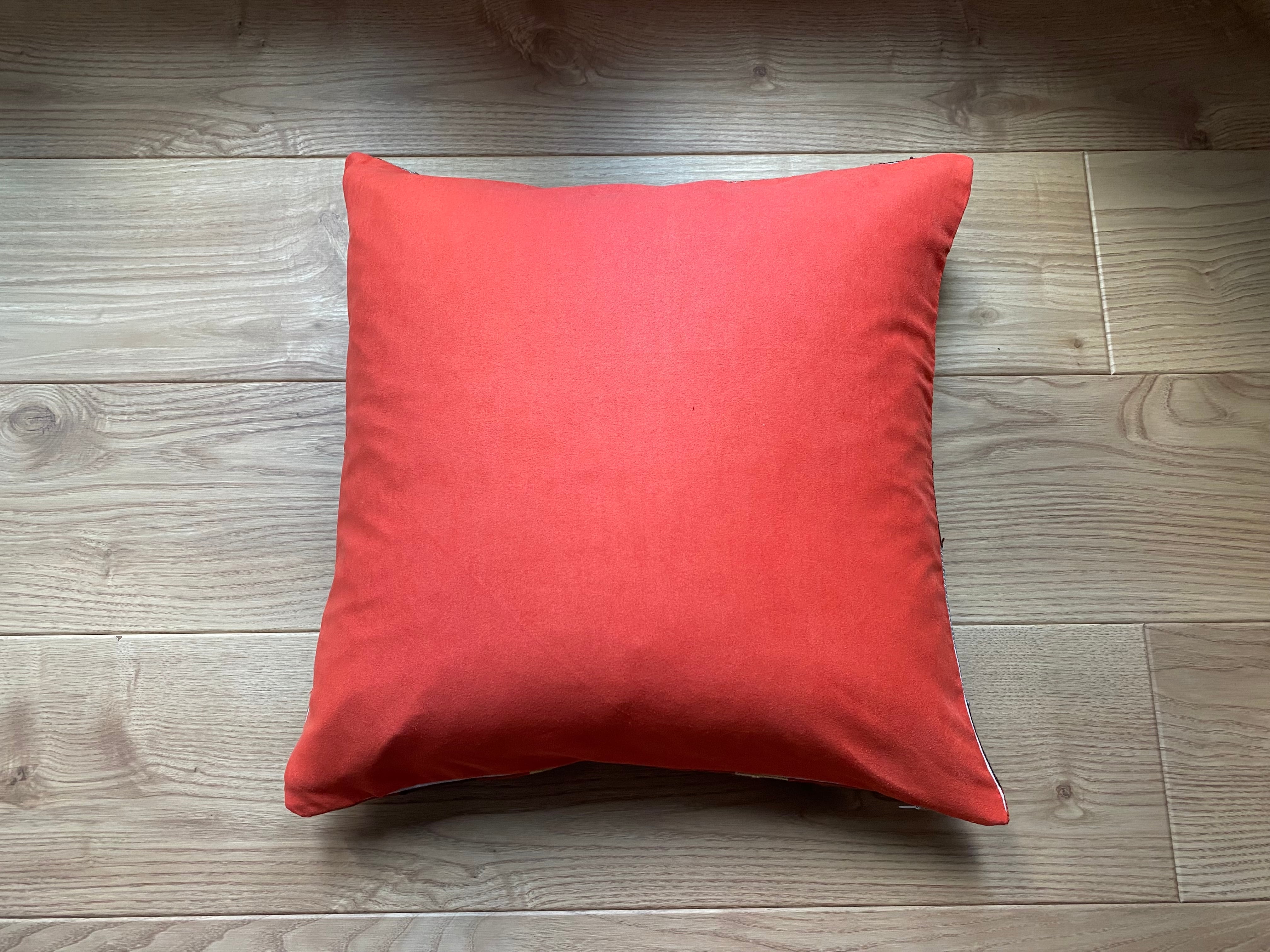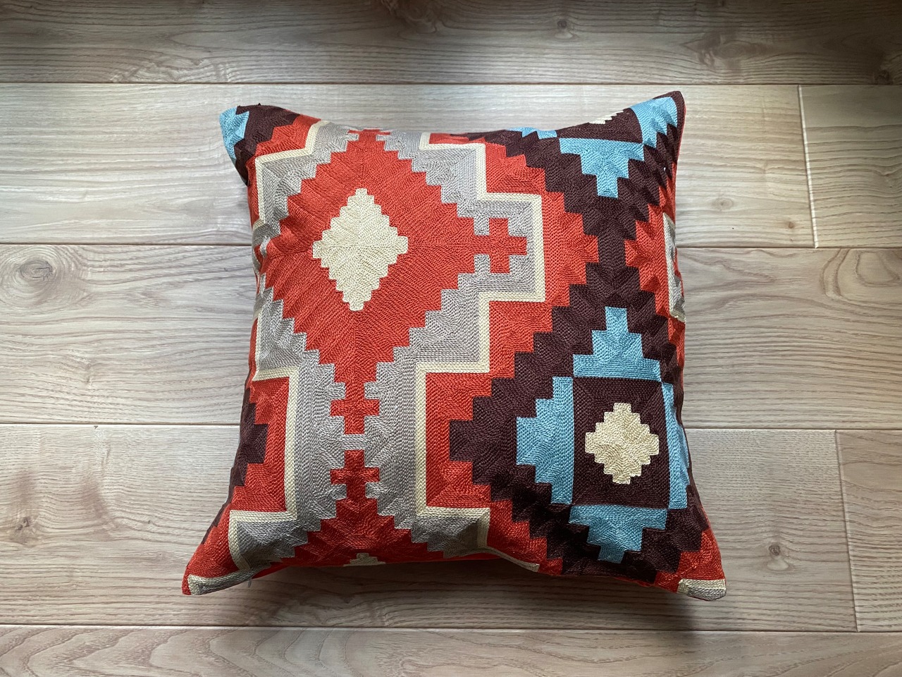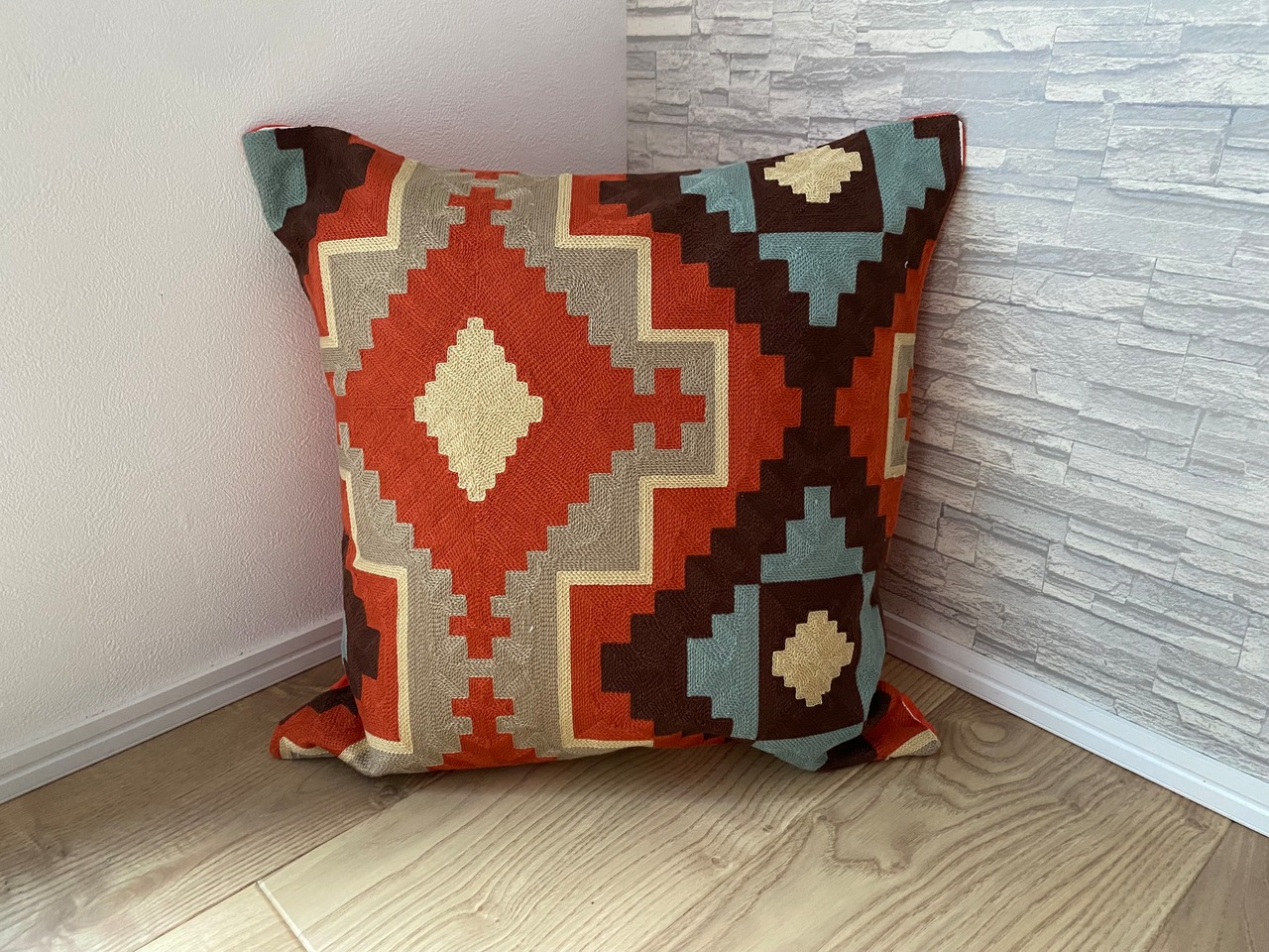 表面は、全面に細かな刺繍が施されており、とても鮮やかです。印象的なデザインと多彩な色使いで、お部屋を華やかに彩ってくれます。